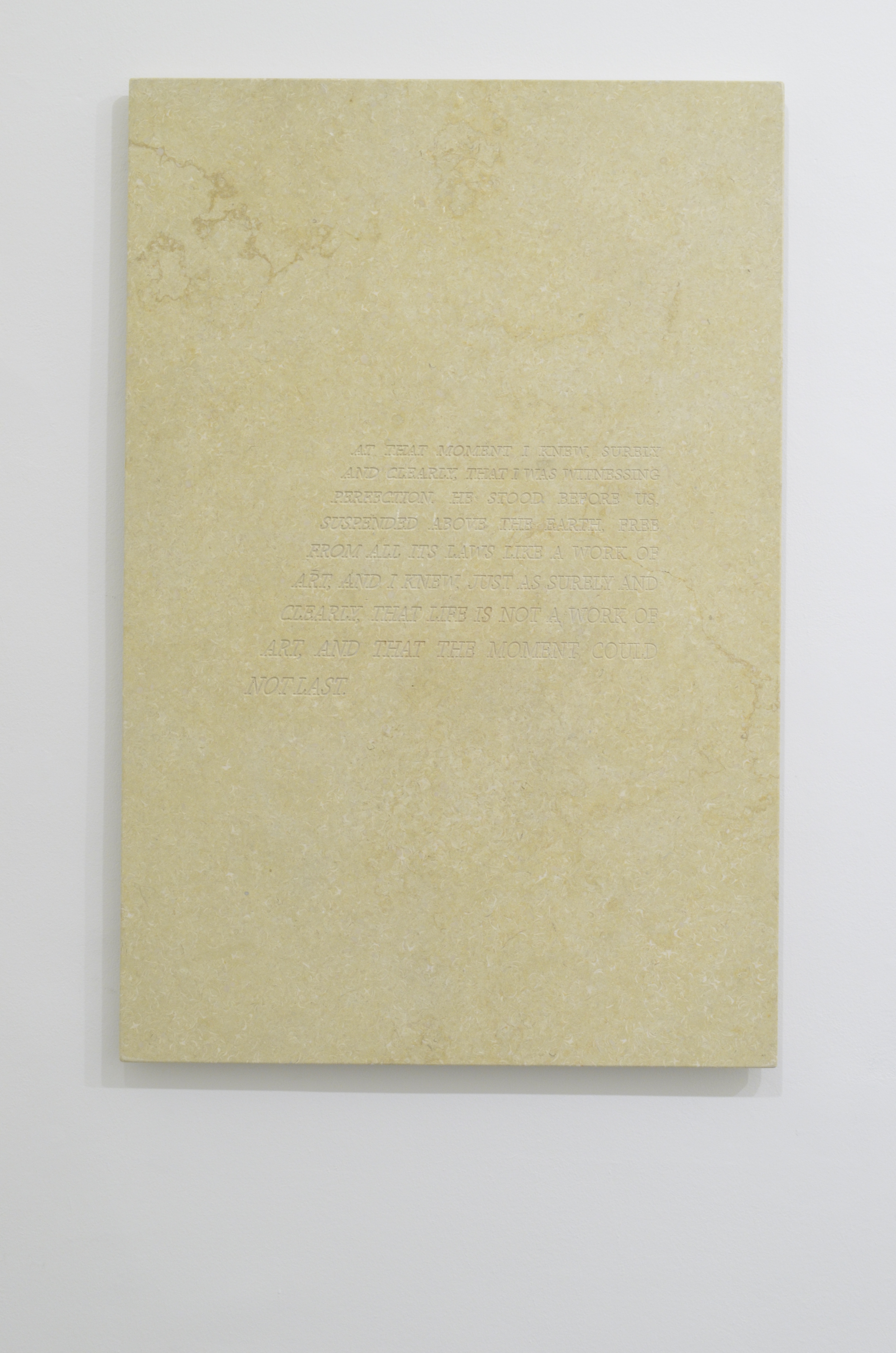 On the wall is an excerpt from an interview with Muntadhar al-Zaidi engraved onto a mirror in Arabic*; a marble slab replicating the inscription from the Michael Jordan statue in front of the United Center in Chicago; a diminutive screen showing a video uploaded onto YouTube by an American soldier in Baghdad. The elements frame the impermanence of many presents, and unsustainable presences.